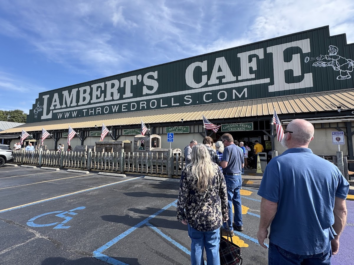 I love Lambert's Cafe!!! Such a fun atmosphere, mainly for kids. My husband doesn't care for his roll being thrown across the room. But, I get a kick out of it. Don't know of any other place where you see that. And talk about the rolls, Yummy and huge!! They serve delicious in-house apple butter and molasses (one of my favorite sweet treats in the world) to go with them. You will not leave this place hungry! My husband thinks it's a "trough" kind of place where you get way too much food. I'm like, keep me at the trough, and keep serving me. I don't mind overstuffing myself a bit on all the fix'ens bc they are so so good. Can order an entree to include the pass arounds, or just order the pass arounds. I usually get BBQ Pork Steak with your choice of 3 sides and all of Lambert's pass arounds. I see why it's one of Lambert's top sellers. I've dined here with several people whom have all gotten different things, which I've tasted (and they are ALL good.) I know i can order anything on the menu, and it be better than home-cooking. All the sides are good too. You can choose from sides shown in pic taken from Lambert's website. I've also included a picture of their Pass-arounds from their website too. It was too much for me to list. I particularly like the potatoes and onions & macaroni and tomatoes. The majority must like all these pass arounds, as much as me, bc they are sometimes slow to come around. The service is good, but this place stays packed with patrons, so you have to be patient for your turn. That's another thing that bothers my husband. He doesn't care for crowds and likes quiet atmospheres. So, this isn't the kind of place for him. Plus, he likes to get in and get out, as quick as possible. I could come everyday, sit back as long as it takes, and enjoy the company, along with goooooood food! Tips: 1)Either get there when they first open, or plan on waiting a long time for a table. 2)Drink containers are huge, so you probably won't want a refill. 3)No fresh lemons, only lemon juice in packages at the table. 4) Pass around(s) are served on paper towels. 5)Be prepared, rolls are in the air everywhere. But, the throwers have pretty good aim. So, you probably won't be hit in the head. lol 6) Have patience bc there's always a lot of people wanting the same thing (their food.) 7)Be prepared for a fun atmosphere that is entertaining for all, (hint hint) wait staff sometimes plays jokes on patrons. 8) I advise you to go online and check out their menu, story, etc.